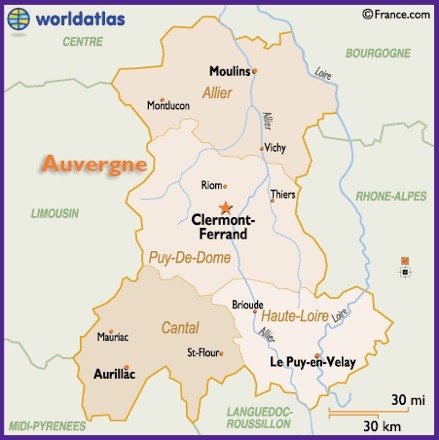 中世には現在のAllierアリエール県にあたる場所はBourbonnaisブルボネ公領(近世フランスのブルボン朝始祖Henri IVアンリ4世や、現在でもスペイン王室とルクセンブルク大公国に続くBourbonブルボン家系の原点)から州編成後はブルボネ州として、そしてそれより以南はAuvergneオーベルニュ伯領からオーベルニュ州という変遷を経てきており、また基本的には王家に近い立場であったことなどから、現在のこの地域圏は他のものに比べて非常に歴史的区分にそって作られていると言えます。 フランスのCentral Massif中央高地に位置する山岳地帯を有する地域圏で、肥沃な土地による農業が主な産業で、地方菓子においてもfruitsフルーツを活用したものが多くあります。また、山岳地帯としての性格を表現した菓子も存在しており、いかに『地方菓子』がその土地の特性を表しているかが見て取れると思います。山岳地帯であるが故にこの地域圏には多くのミネラルウォーターの源泉があります。日本で最も有名なのがVoivicヴォルヴィック(Puy de Dôme)ですが、他にもChâteldon(Puy de Dôme)Vichyヴィシー(Allier)、Arvieアルヴィ(Ardes sur Couze / Puy de Dôme)、Rozanaロザナ(Rouzat / Puy de Dôme)、Saint Géronサン・ジェロン(Haute Loire)、Sainte Margueriteサント・マルグリット(Saint Maurice / Puy de Dôme)、Saint Yorreサン・ヨール(Allier)などを買い求める事が出来ます(括弧内は源泉町名 / 所属県名、商品名と町名が同じ場合は所属県名のみ)。