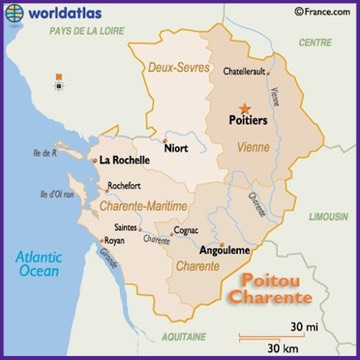 この地域圏はその創設において、北西のNantesナントと首府とするPays de la Loireペイ・ド・ラ・ロワール地域圏、北東のToursトゥールを首府とするCentreサントル地域圏、南のBordeauxボルドーを首府とするAquitaineアキテーヌ地域圏という当時の政府にとって重要な地域圏(Pays……はBretqgneブルターニュ地域圏創設にあたっての措置(詳しくはPays de la Loire参照)、TourとBordeauxには世界大戦時にParisから避難した臨時政府も置かれた)に挟まれた空白地帯に、それを埋めるために3地域圏のどれにも歴史的に共通していいない地域圏として誕生しました。当時は元々長い事フランス王領であったPoitouポワトー州、Saintongeサントンジュ州、Aunisオーニス州、そしてフランス王に近いヴァロワ・オルレアン(後のヴァロワ・アングレーム)家の所領であったAngoumoisアングーモワ州の4州を空白地帯を埋めるという名の下統合されました。このように、同じような様々な歴史的領地の寄せ集めであるLanguedoc Roussillonラングドック・ルシヨン地域圏とは異なり(Languedoc Roussillon参照)、古くから長くフランス王家の一部として歩んで来たという歴史的・文化的バックグラウンドを持った地域で、かつ地形的にも全くの平地であるため、『地方菓子』についてはこの地域圏のみにあてがう事ができる特徴的な菓子が存在してます。