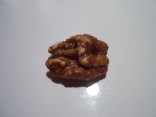 直訳すると「クルミの半身」といったところです。noixは固い殻(核果)を割った中に写真のような種子(仁)の部分が二つくっついて入っていますが、これを写真のように単体にしたもののことを(一般的に食材としての目にするクルミのことを)cerneaux de noixと言います。これはそのままの名前を用いた菓子です。これはLimousin南部からPérigord各地の至る所で見られる『地方菓子』の一つです。これはgrillé焼く場合とそうでない場合があり、店によってまちまちですが、それらをcaraméliséキャラメル掛けしたものに光沢をつけています。これはpralinéプラリネの要領と同じです。