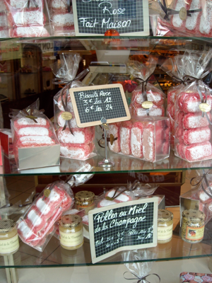 この地域圏で唯一にして絶対の『地方菓子』です。biscuitとはbis(2)、cuit(焼く)という様に、元々は二度焼くという意味です。そこから転じて「二つの行程を経る」という風に使われています。よく言われるようにgénoiseジェノワーズは共立て(全卵)、biscuitは別立て(卵黄・卵白を分けてそれぞれ立てる)です。Biscuit Roseの特徴の一つとしてそのピンク色があり、伝統的にcarminコニチール色素を使っています。これは加熱に強いという特徴からだと思います。元々は染料や絵の具に使われ、中世では高級品でしたが、この原料が昆虫であることは意外なところです。さて、この菓子は仕込んだ生地を特徴的な長方形の型に流し上からsucre glace粉糖を振り、とても低い温度、もしくは乾燥状態にある場所にて表面を乾燥させます。そして次にそれなりに高温のオーブンで一気に焼き上げます。ですので外側はそれなりに固い皮ができ、中はフワッというよりはサクッとした感じになります。そしてそれをchampagneに浸して食べるのがà la champagneシャンパーニュ風です。