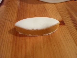 その発祥はAix en Provenceエクス・アン・プロヴァンスであると言われており、今でもここのものは特別d’Aixデックスと名前がついています。現在ではPACAのみならずフランス全土で見る事ができる菓子ではありますが、特徴的な楕円の菱形とその構成については統一されていると思われます。昔の文献ではamande émondée湯剥きしたアーモンドとfruits confitsとその余りのsiropを混ぜ合わせたものをbroyeurブロワイヨ(粉砕器)で擦り砕きpâteペースト状にし、それにsiropを足して鍋で炊き上げ、pain azyme(イーストの入っていないユダヤ教の伝統的なパン)の上に伸ばして固め、それを特別な型でぬき、その上にglace royal(blanc d’œuf卵白、sucre glace粉糖、jus de citronレモン汁で堅さを調整した上掛け)を塗り、乾かしたものです。最近ではamande émondéeとfruits confits(最もベーシックなものはconfit de Melonメロンの砂糖漬け)をbroyeurで擦り砕き、それをそのまま炊かずに流し、抜き、塗り、乾かしています。なので、若干フルーティーです。
